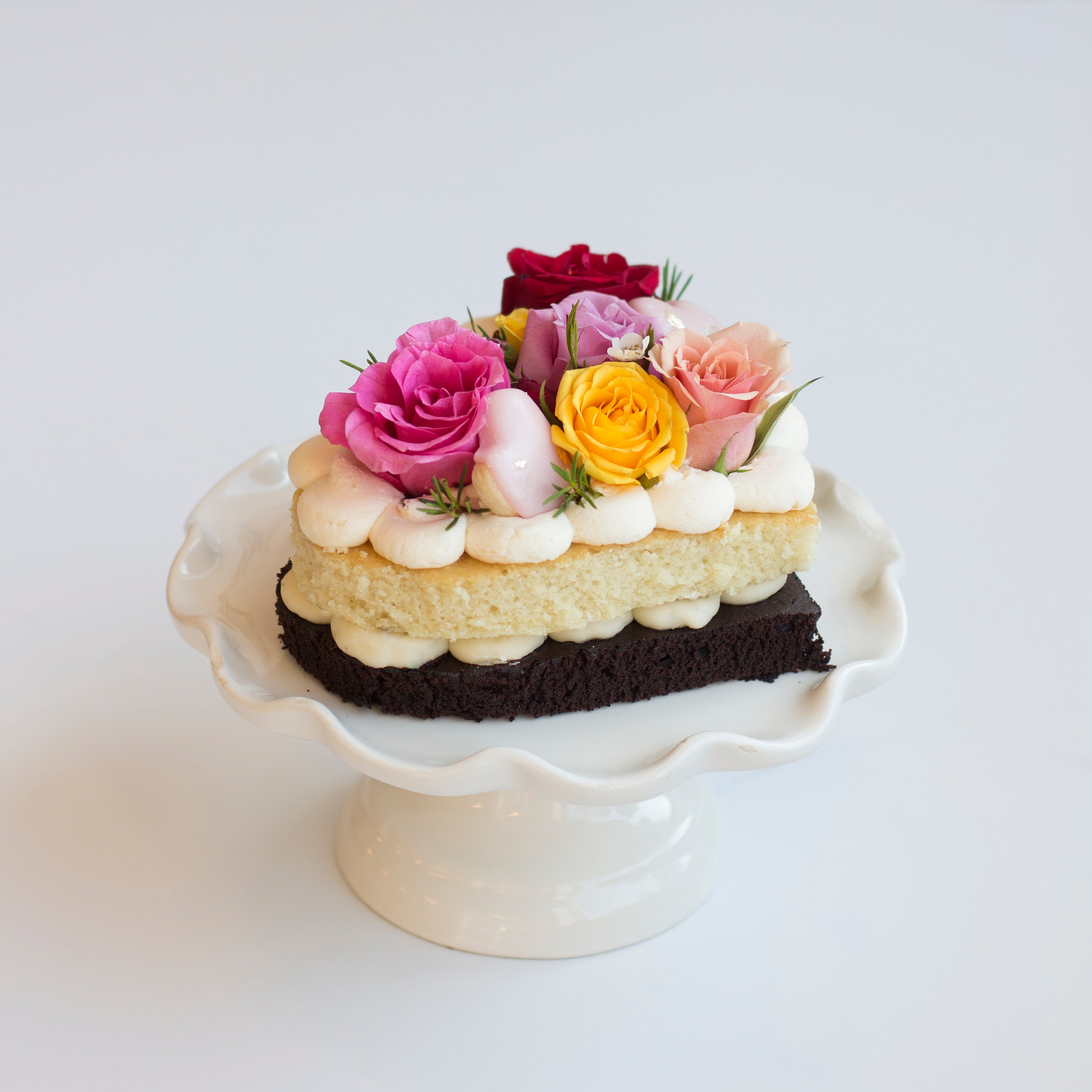 Enjoy this beautiful sweet treat with your loved ones this Valentines Day! Offered in chocolate, vanilla, or half & half, with our signature buttercream. Each cake is unique and adorned with an assortment of fresh florals and heart treats!